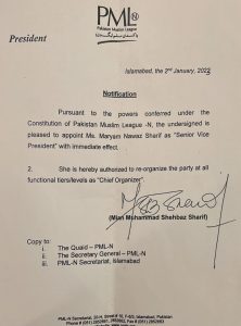 PML-N President Shehbaz Sharif announced the organizational decision of the party. Shahbaz Sharif appointed Maryam Nawaz as senior vice president of Pakistan Muslim League-N. Spokesperson PML-N Maryam Aurangzeb issued a notification of the party president’s decision. The notification was issued with the signatures of PML-N President Shehbaz Sharif.